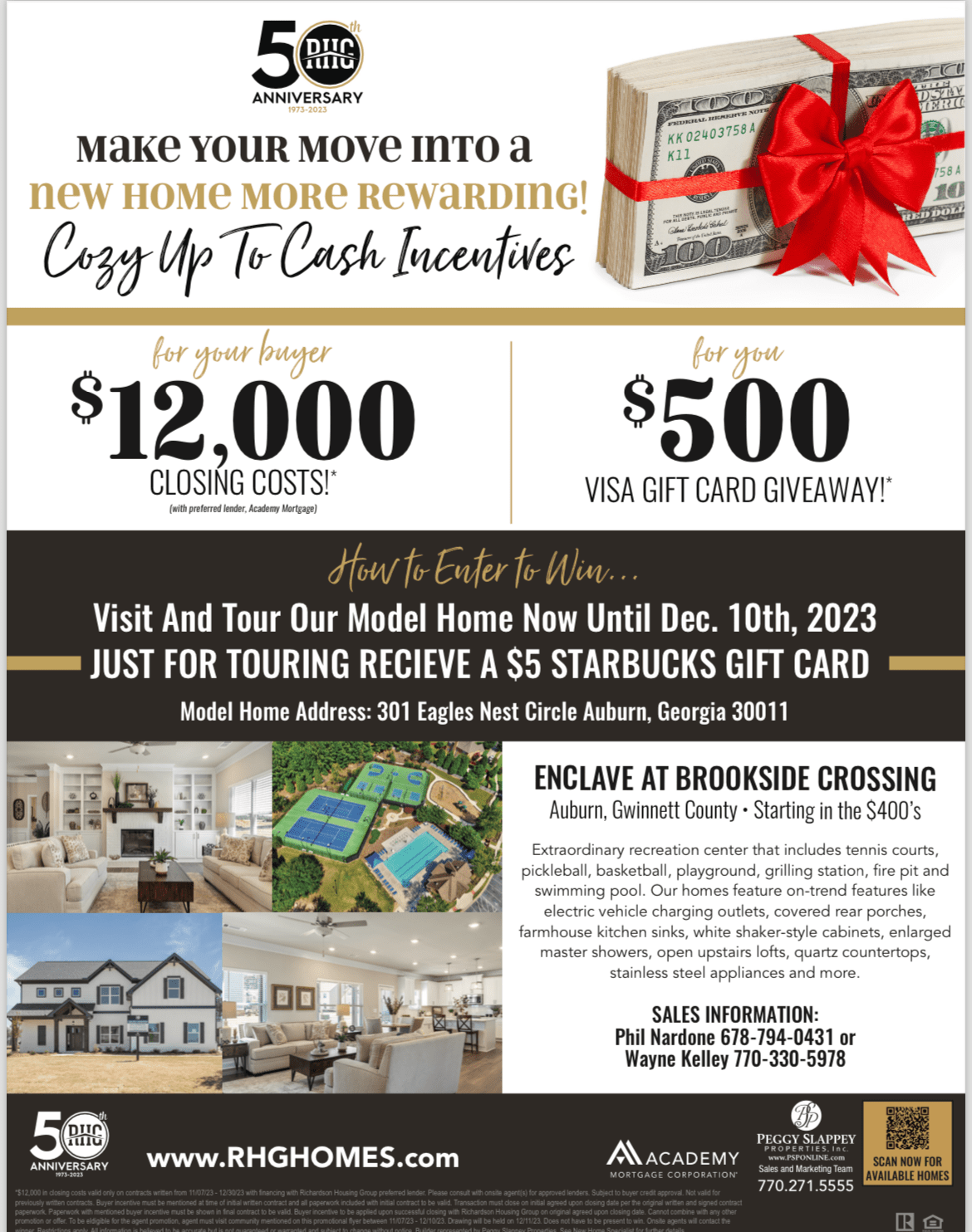 A little extra cash can go a long way this time of year! That’s why Richardson Housing Group is inviting you to cozy up to cash incentives with new homes at Enclave at Brookside Crossing in Auburn, Georgia. For a limited time, qualifying buyers can receive $12,000* in closing costs with RHG’s preferred lender. Agents, when you visit the neighborhood between now and December 10, 2023, you can enter to win a $500 Visa gift card*. Just for visiting, you’ll also receive a $5 Starbucks gift card!